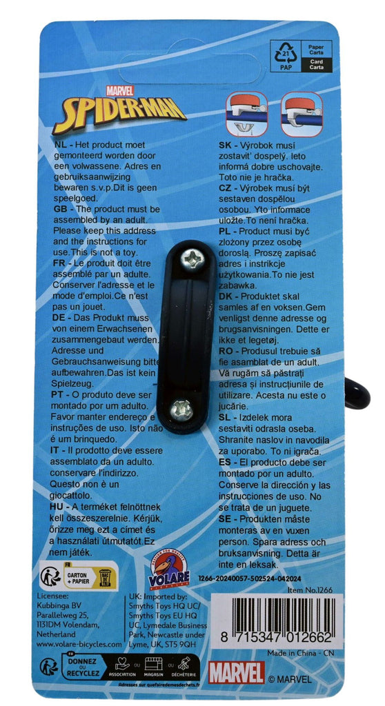 Deze coole Marvel Spider-Man fietsbel is makkelijk te bevestigen aan de fiets van iedere Spider-Man-fan! Laat je fietsbel klinken, zodat iedereen weet dat je de hoek om komt. Ring-ring!