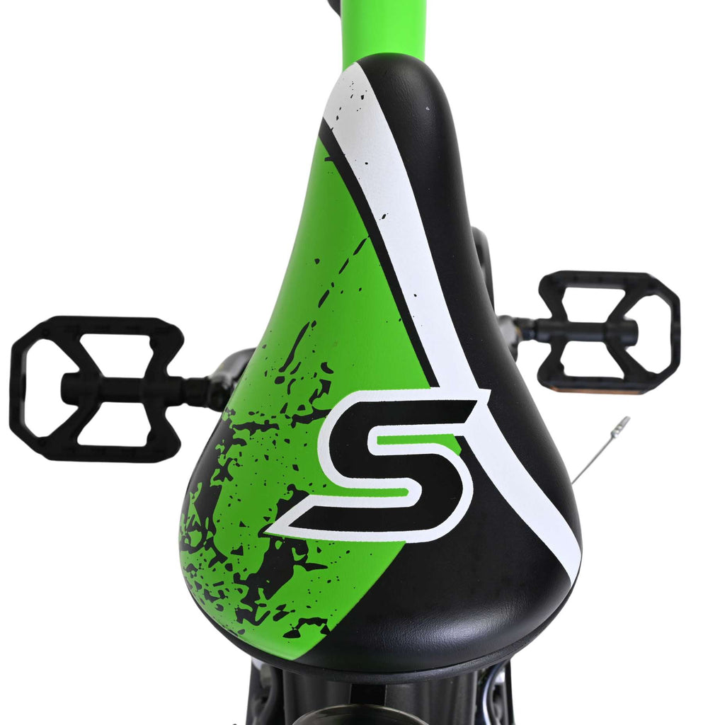 Veiligheid staat voorop! Daarom heeft deze gave fiets twee handremmen en geen terugtraprem! Het sterke stalen frame heeft met de stoere neon groen met zwarte kleurstelling een zeer sportieve uitstraling. Met de bidon in de praktische bidonhouder heeft uw kind altijd iets te drinken bij zich. De spatborden houden al het opspattend vuil tegen. Ter bescherming van de kleine vingertjes is de kettingkast gesloten. De fiets heeft zijwielen en een stevige standaard.