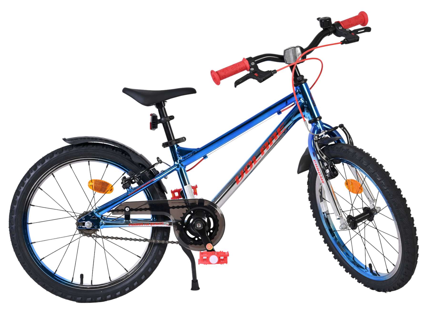 De Volare Chrome 18 inch in blauw met zilveren accenten is een stoere kinderfiets met een sportieve uitstraling en een stevige, kindvriendelijke afwerking. De opvallende kleurcombinatie en details maken deze fiets een echte blikvanger op straat en op het schoolplein.