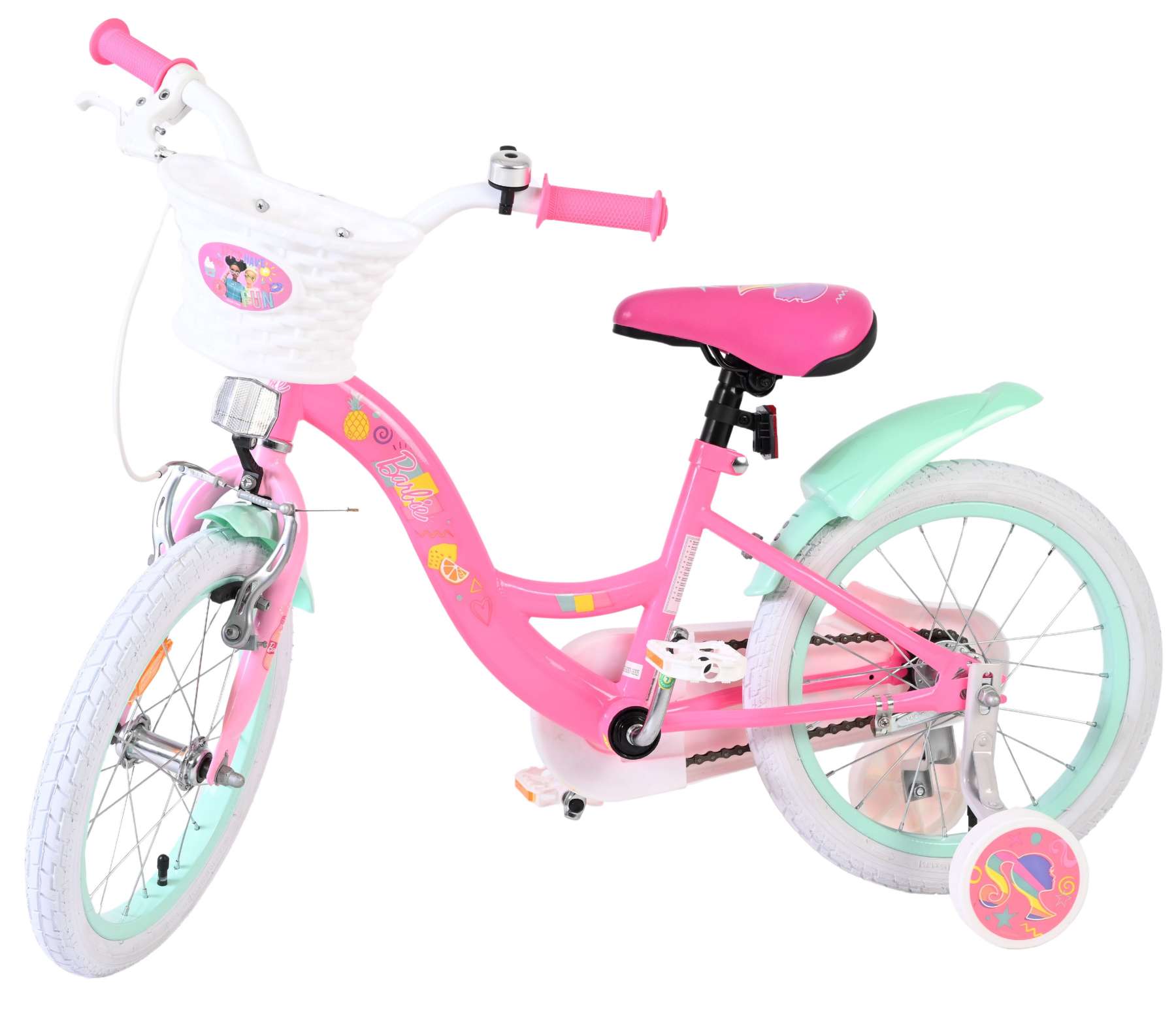De afneembare zijwieltjes helpen kinderen stap voor stap leren fietsen, en zodra ze klaar zijn om zelfstandig te rijden, kunnen de zijwielen eenvoudig worden verwijderd. Het zadel en stuur zijn in hoogte verstelbaar, zodat de fiets met je kind meegroeit. Voorop de fiets zit een mooi voorplaatje met een vrolijke Barbie-afbeelding dat de fiets helemaal compleet maakt.