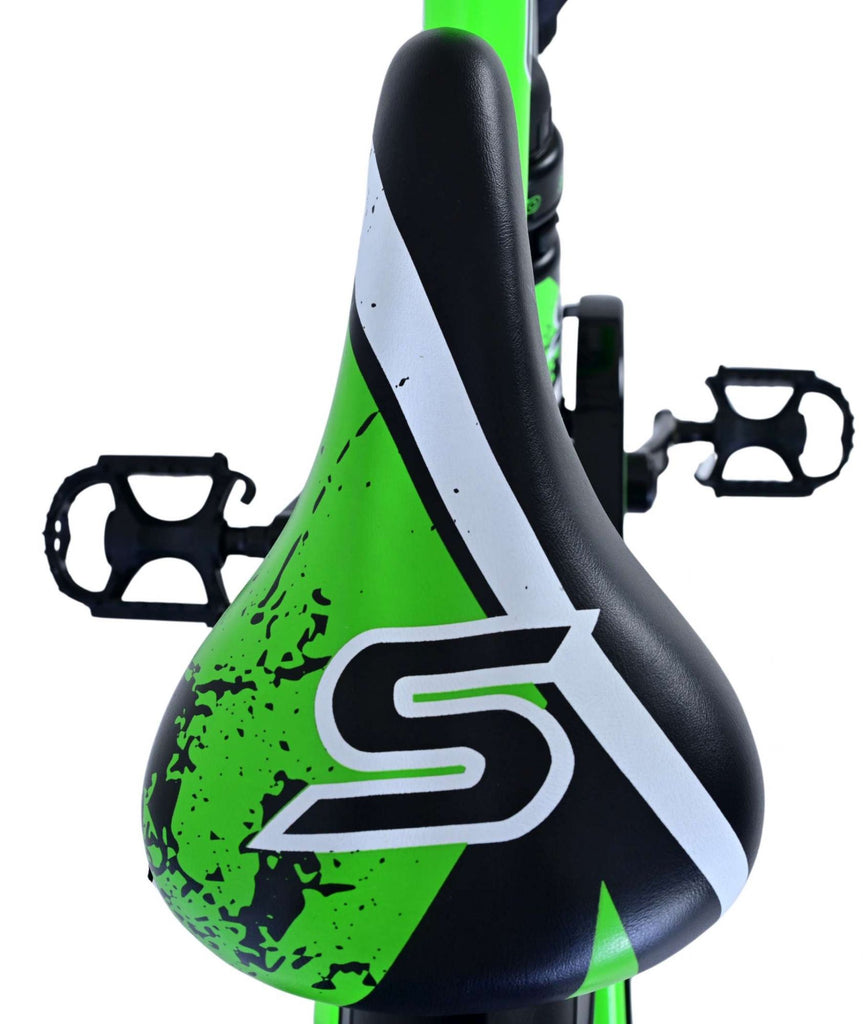 Veiligheid staat voorop! Daarom heeft deze gave fiets een handrem en terugtraprem. Daarnaast heeft de fiets een leuke bel en reflectoren in de wielen. Ook aan het comfort is gedacht. De mooie zwarte Volare fiets met groene accenten heeft een standaard zodat hij netjes blijft staan. Om zo lang mogelijk van de fiets te kunnen genieten heeft deze een extra lange zadelpen waardoor de fiets nóg langer met het kind meegroeit en ook het stuur is in hoogte verstelbaar.