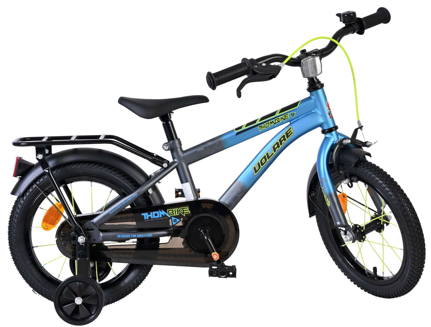 De Volare Thombike 14 inch in blauw met grijze accenten is een stoere kinderfiets met een sportieve uitstraling, perfect om veilig en met vertrouwen te leren fietsen. Dankzij de stevige afwerking en het frisse design is dit een echte favoriet voor jonge rijders.