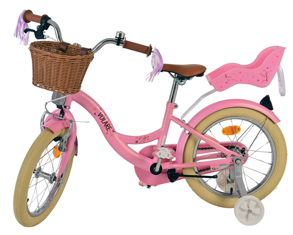 Veiligheid staat voorop! Daarom heeft deze gave fiets een handrem en een terugtraprem, afneembare zijwieltjes en een gesloten kettingkast. Ook aan het comfort is gedacht. De mooie roze Volare fiets heeft een comfortabel zacht zadel, een poppenzitje, vrolijke handvatversieringen en een handig rieten mandje. Om zo lang mogelijk van de fiets te kunnen genieten zijn het zadel en stuur in hoogte verstelbaar. Wordt geleverd inclusief al het montagemateriaal dat nodig is om de fiets in elkaar te zetten!