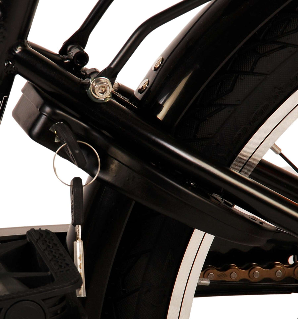 Veiligheid staat voorop! Daarom heeft deze gave fiets een handrem en terugtraprem en verlichting op batterij voor en achter. Daarnaast heeft de fiets een leuke bel en reflectoren in de wielen. Ook aan het comfort is gedacht. De mooie zwarte Volare fiets met groene accenten heeft een luxe zacht zadel en extra zachte handvaten, een handige achterdrager, en een stevig frame dat wel tegen een stootje kan. Verder heeft de fiets een standaard zodat hij netjes blijft staan en een sterk slot. Om zo lang mogelijk van de fiets te kunnen genieten heeft deze een extra lange zadelpen waardoor de fiets nóg langer met het kind meegroeit en ook het stuur is in hoogte verstelbaar.