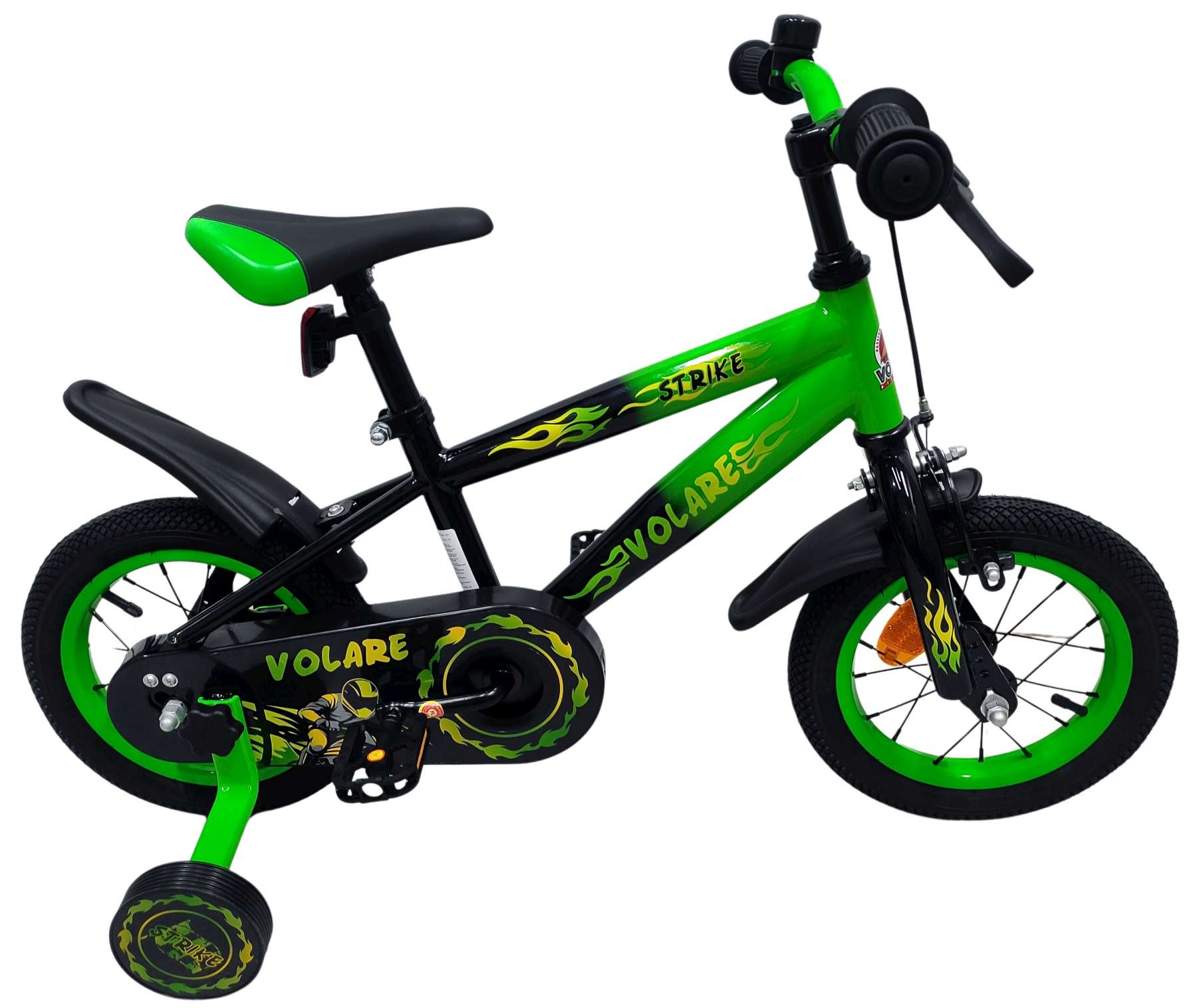 De Volare Strike 12 inch kinderfiets is een stoere fiets voor jonge racers die klaar zijn voor hun eerste avonturen op twee wielen. Met zijn sportieve zwart-groen design en robuuste uitstraling is deze fiets een echte blikvanger.