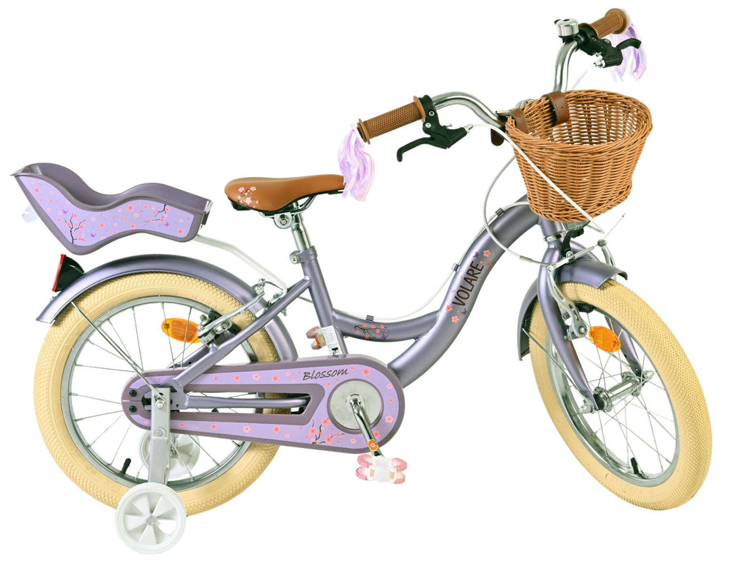 Veiligheid staat voorop! Daarom heeft deze gave fiets geen terugtraprem maar twee handremmen, afneembare zijwieltjes en een gesloten kettingkast. Ook aan het comfort is gedacht. De mooie paarse Volare fiets heeft een comfortabel zacht zadel , een poppenzitje, vrolijke handvatversieringen en een handig rieten mandje. Om zo lang mogelijk van de fiets te kunnen genieten zijn het zadel en stuur in hoogte verstelbaar. Wordt geleverd inclusief al het montagemateriaal dat nodig is om de fiets in elkaar te zetten!