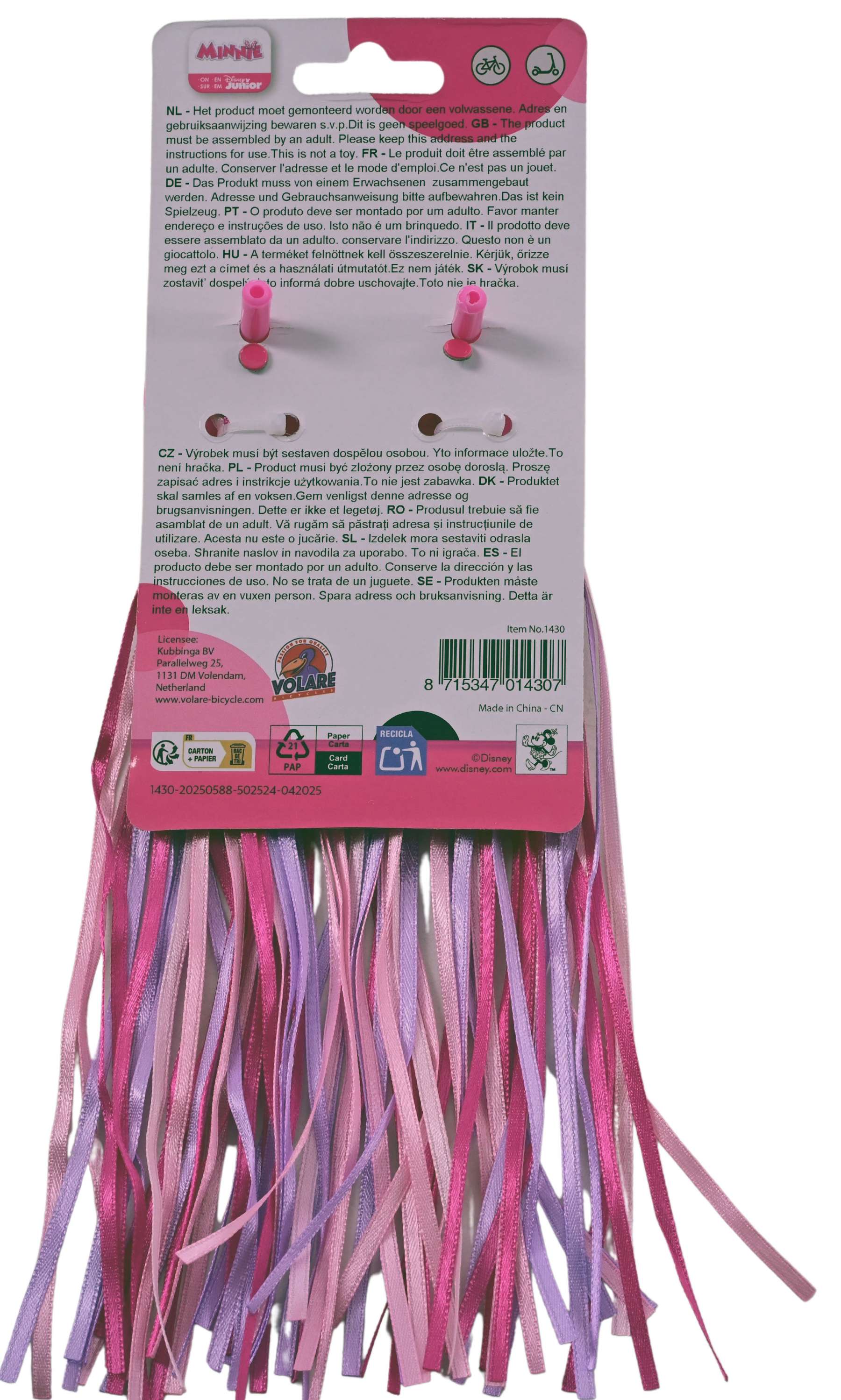 Breng extra vrolijkheid op de fiets met deze Minnie Mouse handvatversiering! De kleurrijke slingertjes wapperen speels mee in de wind en zorgen voor een feestelijk effect tijdens elke rit. Op de ronde bevestiging prijkt een schattige afbeelding van Minnie Mouse – ideaal voor kleine fans van deze iconische Disney-figuur.