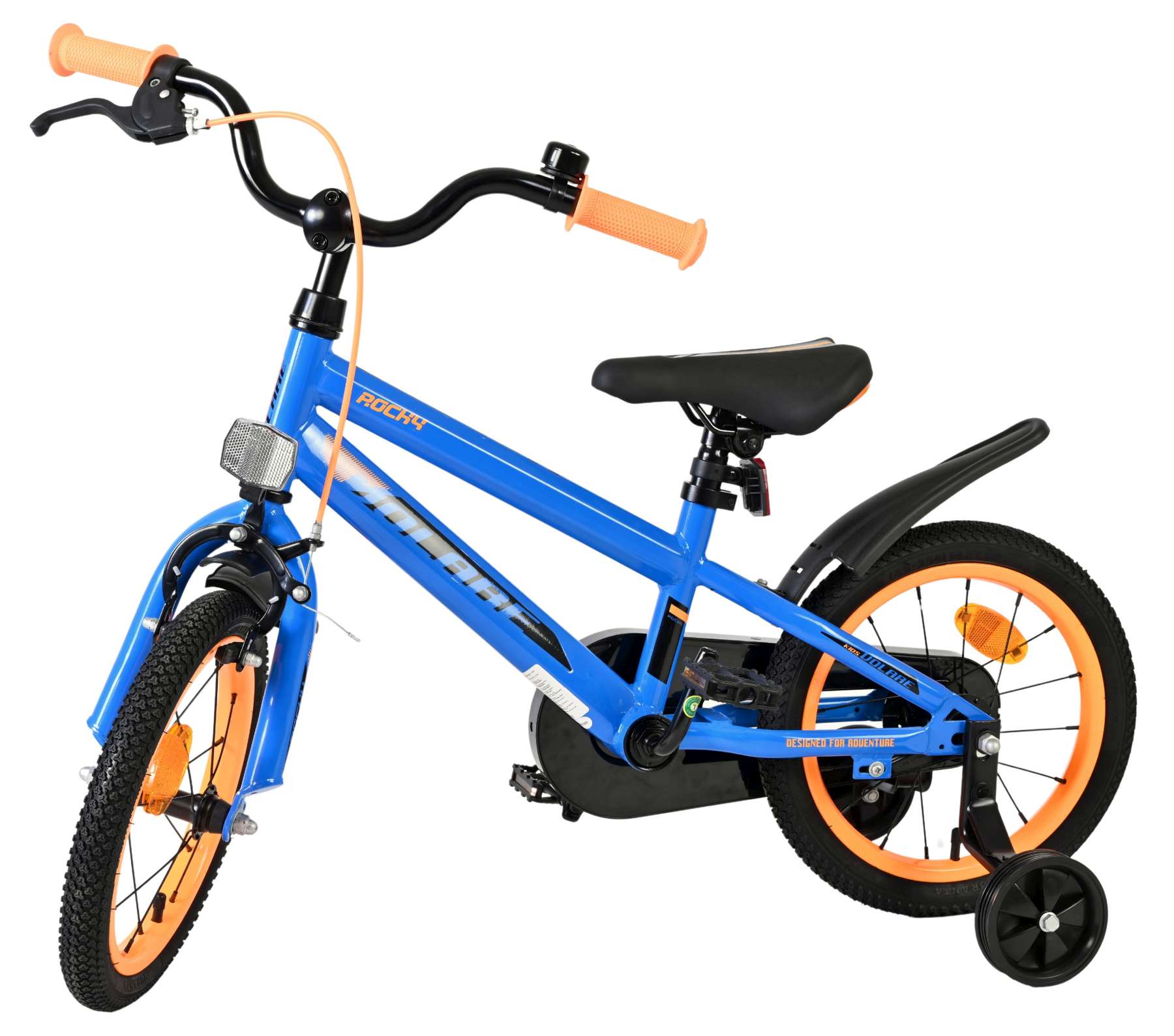 Veiligheid staat voorop! Daarom heeft deze gave fiets een handrem en terugtraprem, een gesloten kettingkast en afneembare zijwieltjes. Daarnaast heeft de fiets een leuke bel. Ook aan het comfort is gedacht. De mooie blauwe Volare fiets met oranje accenten heeft een luxe zacht zadel, een strak frame dat wel tegen een stootje kan, en extra lange spatborden om al het vuil tegen te houden. Om zo lang mogelijk van de fiets te kunnen genieten heeft de fiets een extra lange zadelpen waardoor de fiets nóg langer meegroeit. Wordt geleverd inclusief al het montagemateriaal dat nodig is om de fiets in elkaar te zetten!