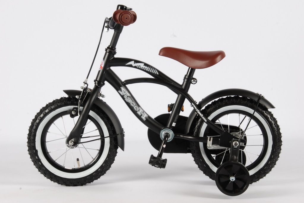 Yipeeh Black Cruiser 12 inch kinderfiets. De Yipeeh Black Cruiser is in mat zwart. In Amerika fietsen de stoere jongens langs de "Beach". Dit wil natuurlijk elke stoere jongen, ook al is hij nog maar 3 jaar. Met stevige zijwieltjes om snel te kunnen leren fietsen. Topper!