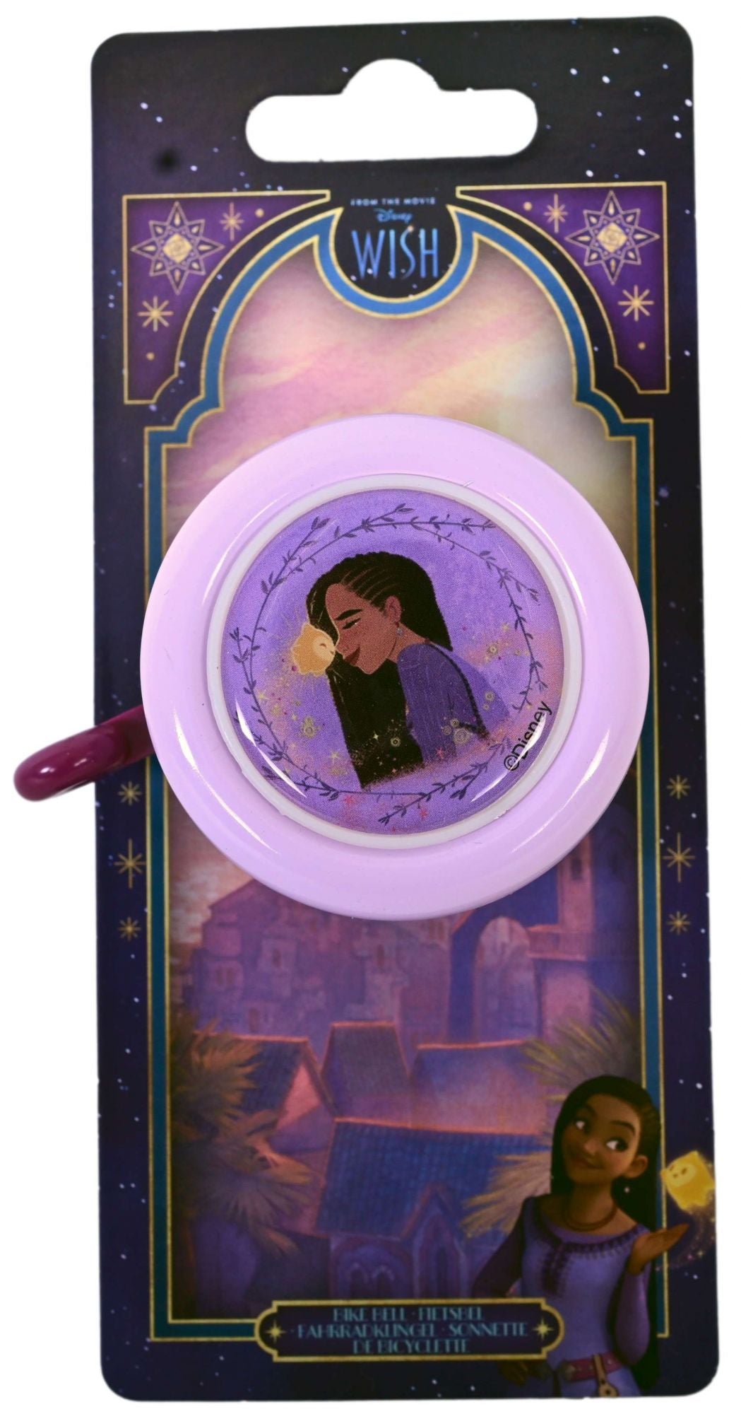 Deze mooie paarse Disney Wish fietsbel is makkelijk te bevestigen aan de fiets van iedere Wish fan! Laat je fietsbel klinken, zodat iedereen weet dat je de hoek om komt. Ring-ring!