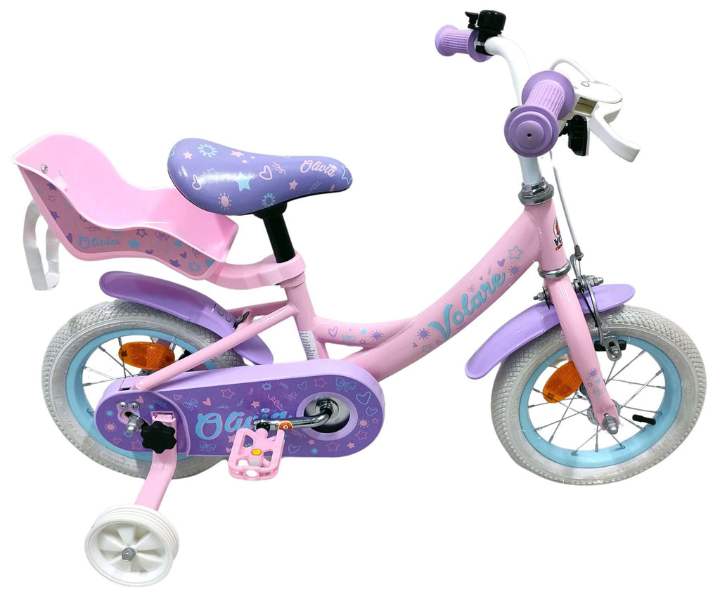 De Volare Olivia 12 inch kinderfiets is een schattige en stijlvolle fiets voor jonge meiden die hun eerste fietservaringen gaan opdoen. Met haar zachte roze kleur, paarse handvaten, zadel en spatborden is deze fiets een echte blikvanger.