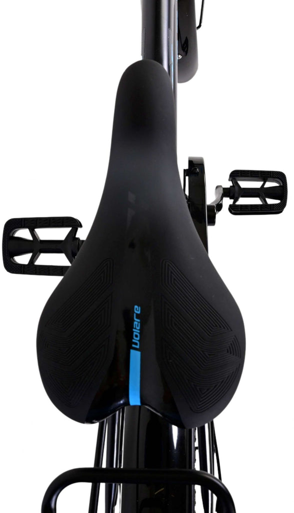 Veiligheid staat voorop! Daarom heeft deze gave fiets een handrem en terugtraprem en verlichting op batterij voor en achter. Daarnaast heeft de fiets een leuke bel en reflectoren in de wielen. Ook aan het comfort is gedacht. De mooie zwarte Volare fiets met blauwe accenten heeft een luxe zacht zadel, 3 versnellingen van Shimano, extra zachte handvaten, een handige achterdrager, en een stevig frame dat wel tegen een stootje kan. Verder heeft de fiets een standaard zodat hij netjes blijft staan en een sterk slot. Om zo lang mogelijk van de fiets te kunnen genieten heeft deze een extra lange zadelpen waardoor de fiets nóg langer met het kind meegroeit en ook het stuur is in hoogte verstelbaar.